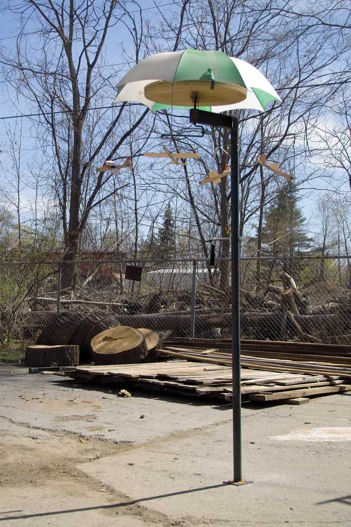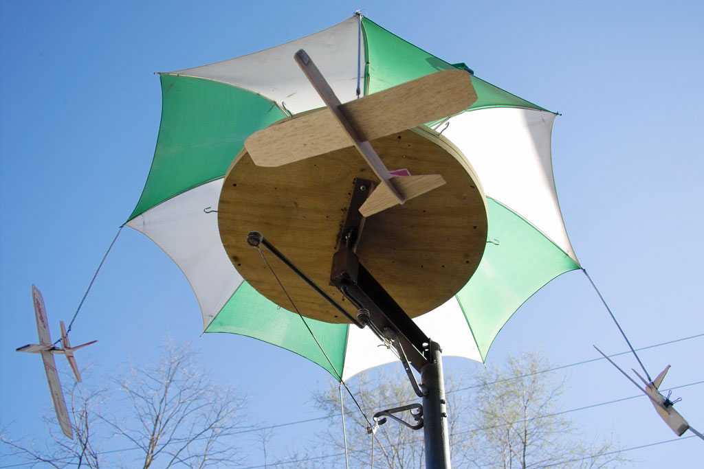 Exploring the outer limits of my senior show, an individual may discover Airplanes, a treadle mechanism combined with the language of a bus stop, umbrella, lamp, and pin wheel, that fulfills a childhood fantasy: toy airplanes perpetually flying against the sky.