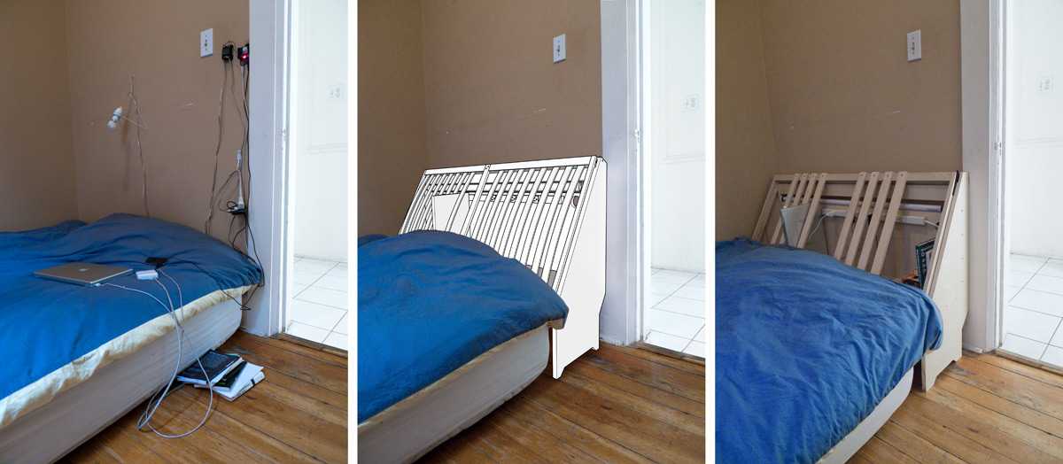 The series began with Ardunio prototypes, utilizing the Pachube service, that explored how subtle and limited streams of data can influence long-distance relationships. These tests led to observations fomenting the design and construction of the headboard pictured. The furniture fills several basic needs, like back-rest and lamp, while also addressing the increasing prevalence of technology in the bedroom with storage and power for digital devices. It also serves as a platform for additional experimentation and data collection.