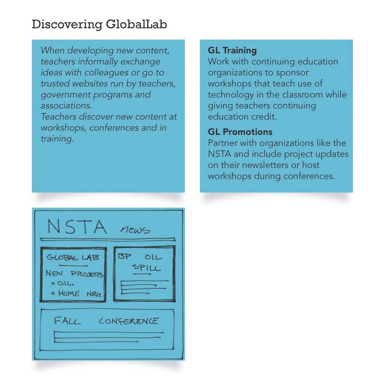 We developed an experience model to bridge the gap between the capabilities of GlobalLabs and the needs of teachers and students. The final map includes many early concepts that could solve these issues. For example, by utilizing the required continuing education system for teachers, GlobalLabs can offer an immediate benefit, educational credits, and help teachers overcome the initial learning curve of trying something new in the classroom.